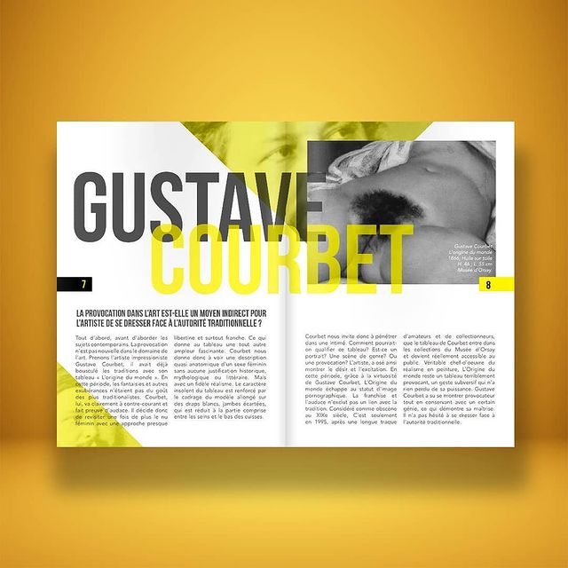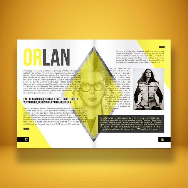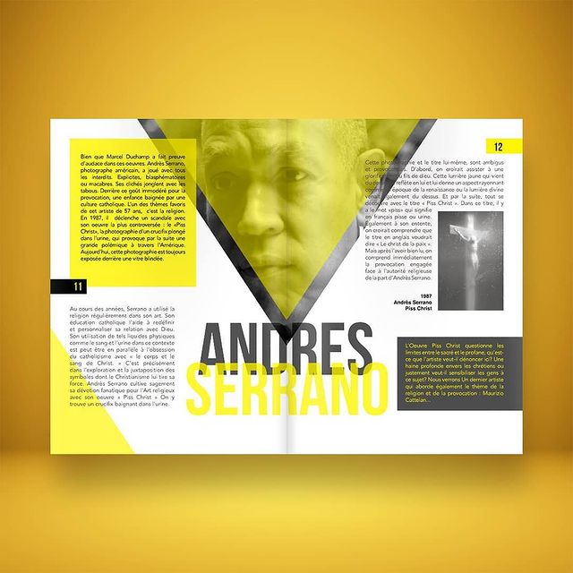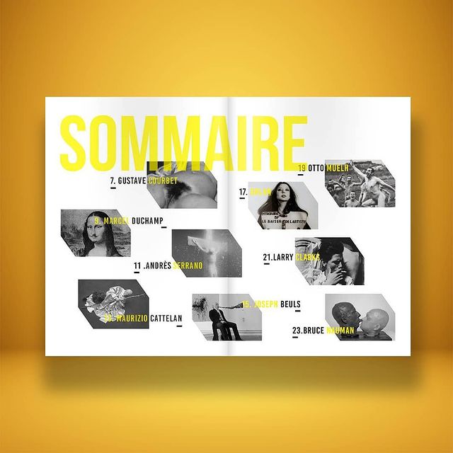 La mise en page est dynamique et percutante : couleurs vives, typographies contrastées, compositions audacieuses. Chaque double-page valorise l’artiste avec un équilibre entre image et texte.